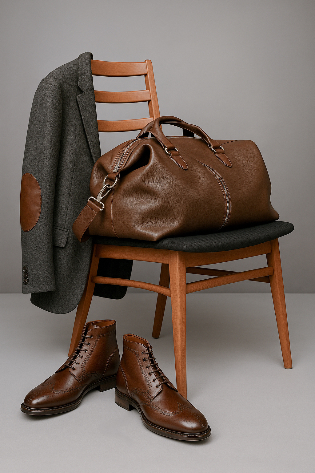 To support the photography campaign, the suggested elements are: Modern wood or leather chair with/without silver parts, wood table, and leather items to help compose the set. See references below.